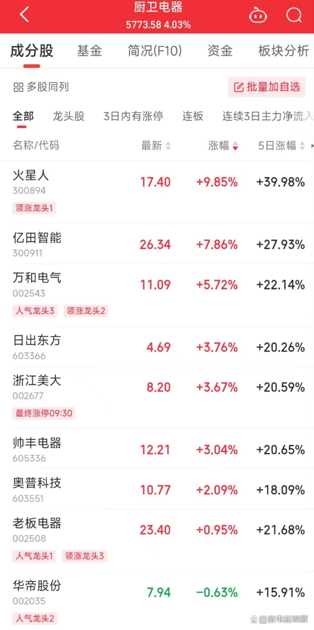 15点31分,厨卫电器板块个股中,火星人、亿田、万和、浙江美大、帅丰、老板电器、华帝股份全线上涨。其中,火星人领涨,涨幅为9.85%,亿田智能、万和电气紧跟其后,涨幅分别为7.86%和5.72%。