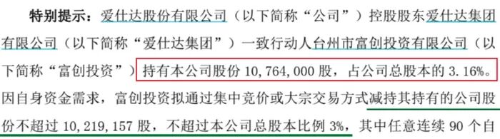 同时,爱仕达近日公告,控股股东一致行动人富创投资拟减持不超1021.92万股,即不超公司总股本3%。关键在于,富创投资当前仅持有公司3.16%股权,顶格减持后将几近清仓,且其第一大股东为爱仕达创始人、董事长陈合林。创始人关联方拟清仓式减持的消息,直接导致公司股价波动,公告后股价连跌4日,累计下跌9.4%。