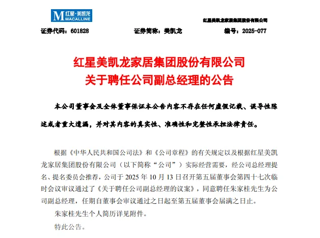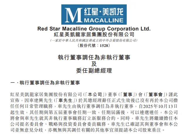 红星美凯龙家居集团10月13日晚公告表示,公司董事会审议通过了董事调职的议案:自2025年10月13日起,车建兴由执行董事调任为非执行董事,任期不变,任期届满后可以连选连任。