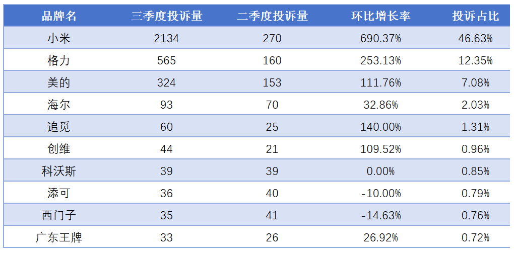 从增长趋势来看,小米的投诉量从二季度的270件激增至三季度的2134件,环比增长率高达690.37%,投诉占比也从二季度的较低水平飙升至46.63%。相比之下,格力环比增长253.13%,美的增长111.76%,小米的增长势头远超行业其他品牌。