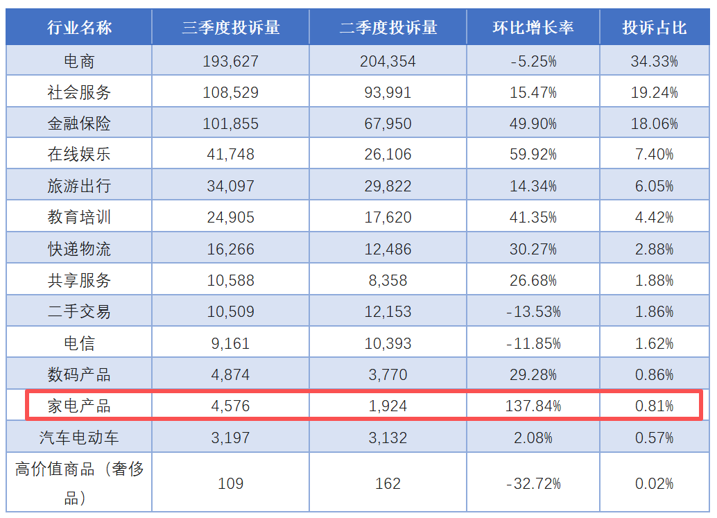 根据《2025年三季度消费保投诉分析报告》显示,2025年三季度消费保平台累计收到消费者投诉56.41万件,环比增长14.61%。在家电产品行业投诉中,虽然总投诉量仅为4,576件,但环比增幅高达137.84%,成为投诉增长最快的领域之一。