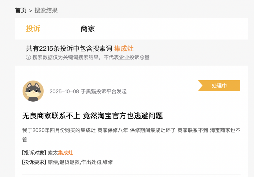 我们在黑猫平台上,看到不少消费者满怀期待购入集成灶后,却遭遇漏油、清洁困难、故障频发、售后不及时等问题,糟糕的使用体验直接透支了整个品类的用户口碑。当行业扩张的红利褪去,缺乏品质支撑的品牌迅速被市场淘汰,而混乱的产品口碑也让潜在消费者望而却步,进一步加速了行业的下滑。