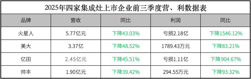 2025年前三季度,这四家企业的营收总和竟不足2021年同期的1/3,4家企业的总营收仅为13.49亿,而总利润则净亏3亿。这个曾经被寄予厚望的新兴品类,以如此剧烈的数字下坠姿态急转直下,让整个厨电行业都猝不及防。
