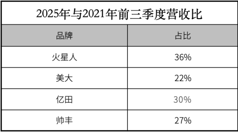 火星人、美大、亿田、帅丰的营收、利润均呈现大幅下滑态势,其营收规模已回落至多年前的历史低位。对比历史数据来看,火星人2025年前三季度营收规模只有2021年同期的36%,整体营收回落至2016-2017年的水平。据历史数据显示,火星人2016年、2017年营业收入分别为 3.44亿元、7亿元。