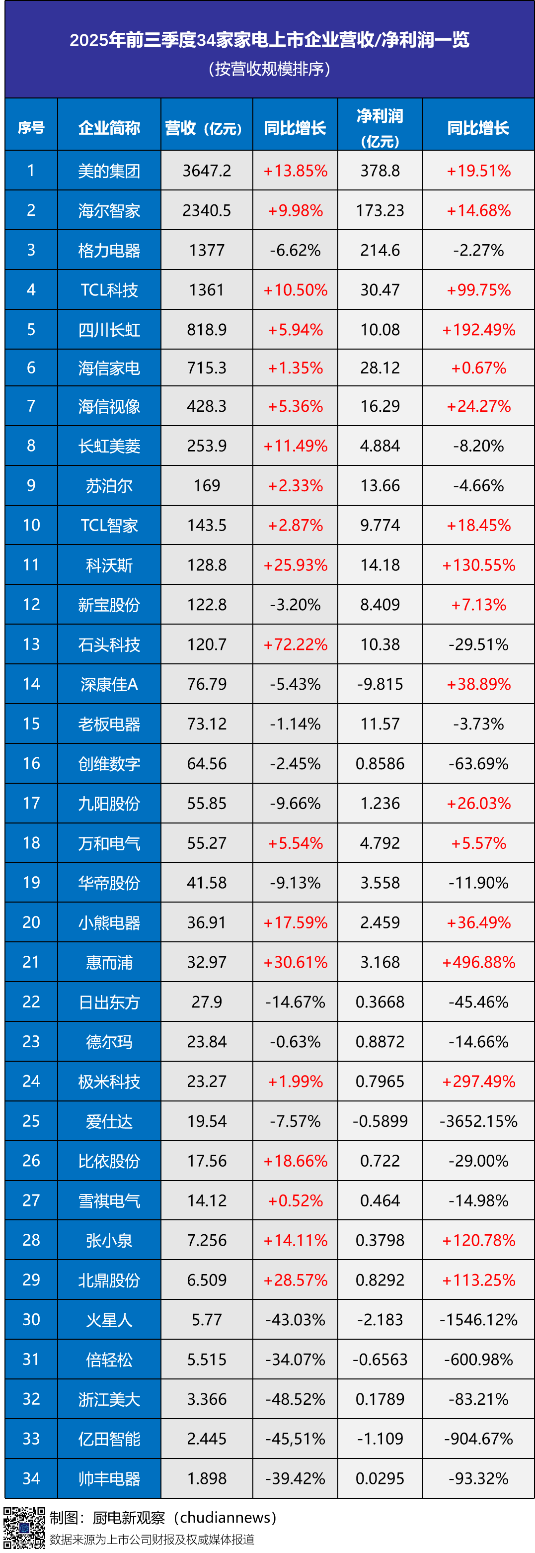 截至目前,A股及H股34家代表性家电上市企业(覆盖白电、黑电、厨电、小家电全品类)2025年前三季度财报已尽数披露。