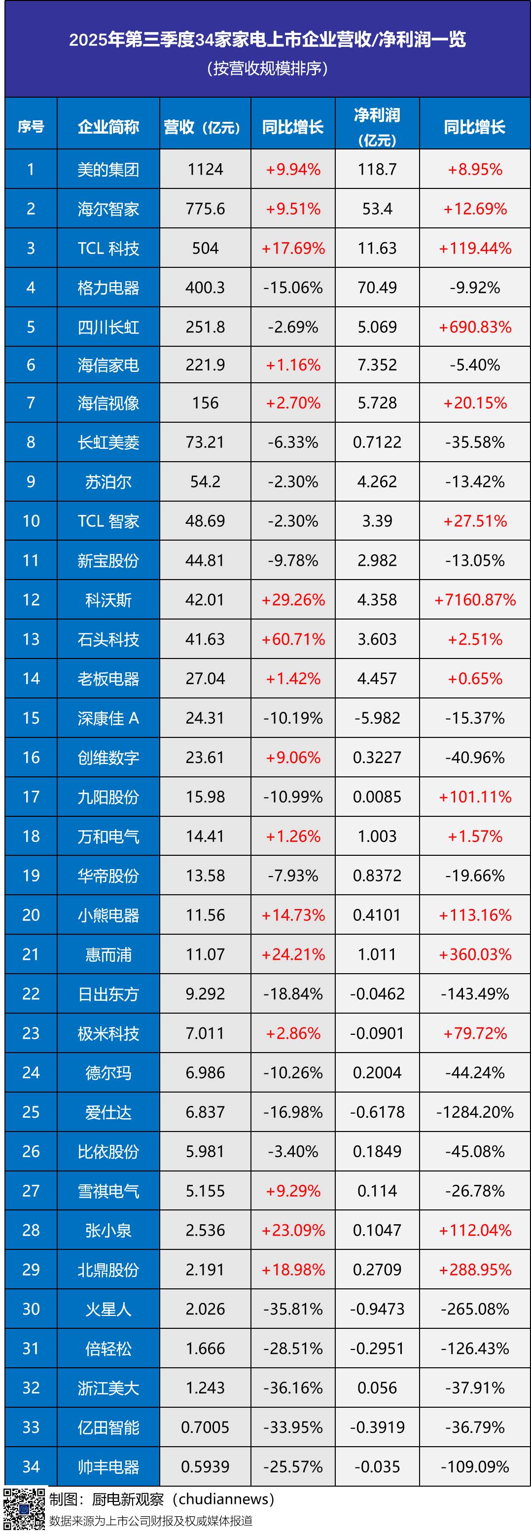 从营收维度看,在大家电大盘稳健向上的背景下,34家企业中超过一半实现营收增长:19家同比上升,15家下滑。其中,美的集团、海尔智家、格力电器依旧稳居第一梯队,合计贡献了行业主要营收增量。