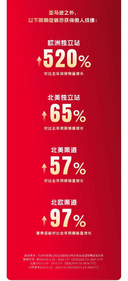 石头科技凭借LDS激光雷达、AI算法等核心技术,在全球智能清洁市场占据重要地位。财报数据显示,2024年其海外营收占比达53.6%;在核心增长点-北美市场,2025年上半年出货量同比大幅增长65.3%。