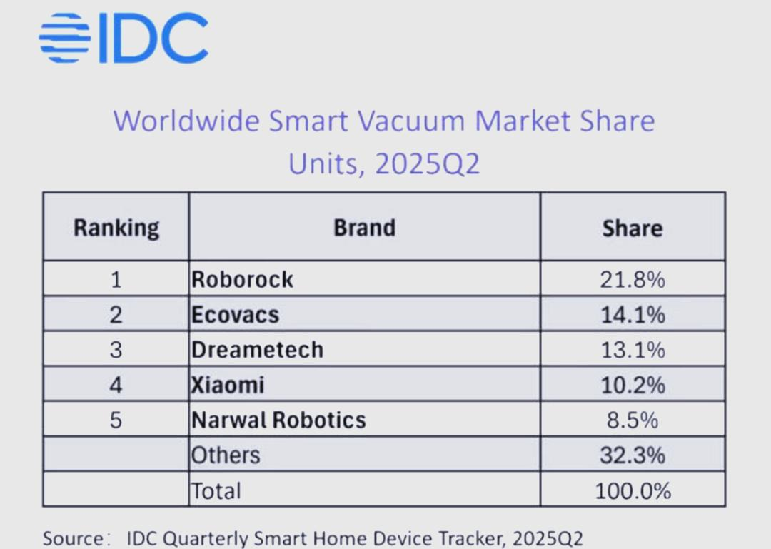 国际数据公司IDC发布的《全球智能家居清洁机器人设备市场季度跟踪报告》显示,石头科技以15.2%的市场份额领跑全球清洁机器人市场,并在核心的扫地机器人品类中以20.7%的份额稳居全球第一。