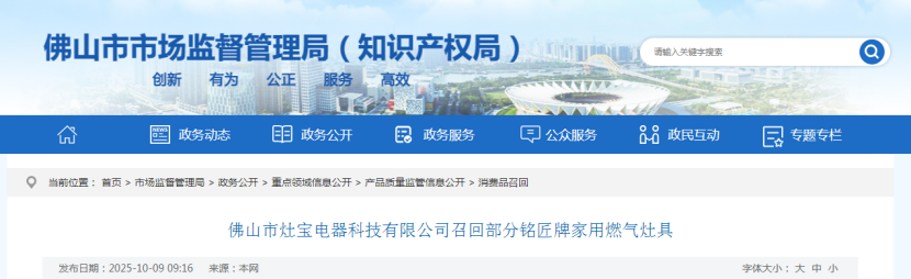10月28日,佛山市灶宝电器科技有限公司按照《消费品召回管理暂行规定》的要求,主动向佛山市市场监督管理局报告了召回计划,将自即日起,召回2024年2月15日制造的部分铭匠牌JZY-X5-2型号家用燃气灶具,涉及数量为10台。