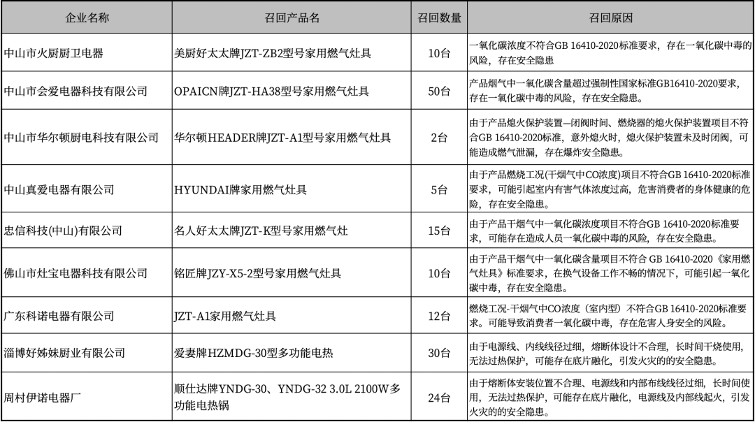 近日,广东、山东等地市场监管局接连发布厨电产品召回公告,涉及家用燃气灶具、多功能水壶、电热锅等多款常用产品。这些被召回的厨电产品因不符合国家强制性安全标准,存在一氧化碳中毒、燃气泄漏爆炸、火灾等安全隐患,生产企业已按《消费品召回管理暂行规定》启动主动召回,通过免费维修、更换或退货等方式消除风险。此次集中召回覆盖中山、佛山等厨电重点产区,涉及美厨好太太牌、爱妻牌、名人好太太、OPAICN、HYUNDAI等多个品牌,提醒消费者及时核查家中相关产品,关注官方召回信息以保障使用安全。