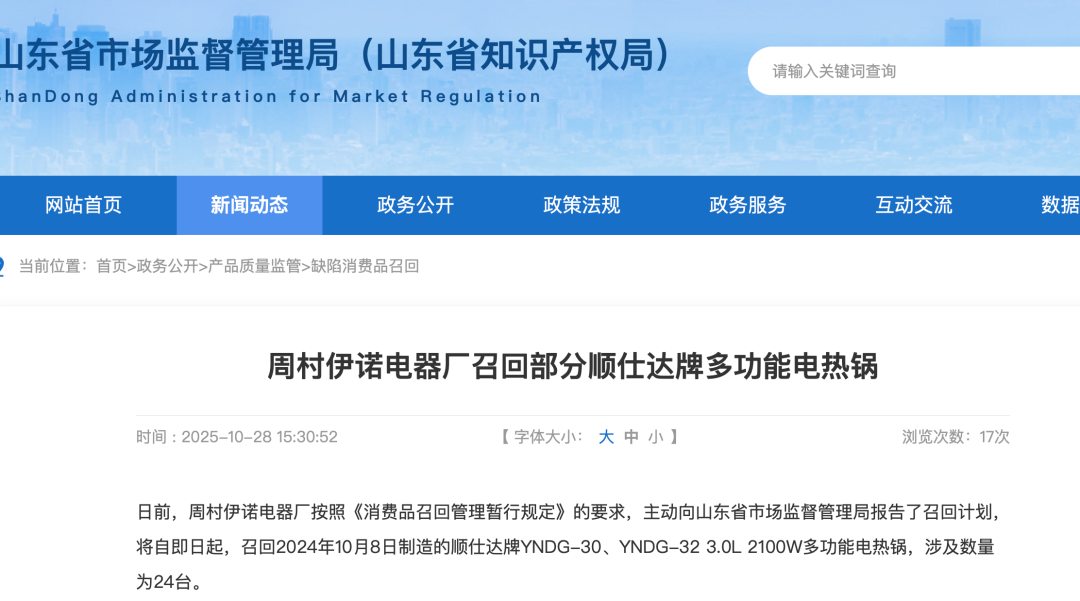 10月28日,周村伊诺电器厂按照《消费品召回管理暂行规定》的要求,主动向山东省市场监督管理局报告了召回计划,将自即日起,召回2024年10月8日制造的顺仕达牌YNDG-30、YNDG-32 3.0L 2100W多功能电热锅,涉及数量为24台。