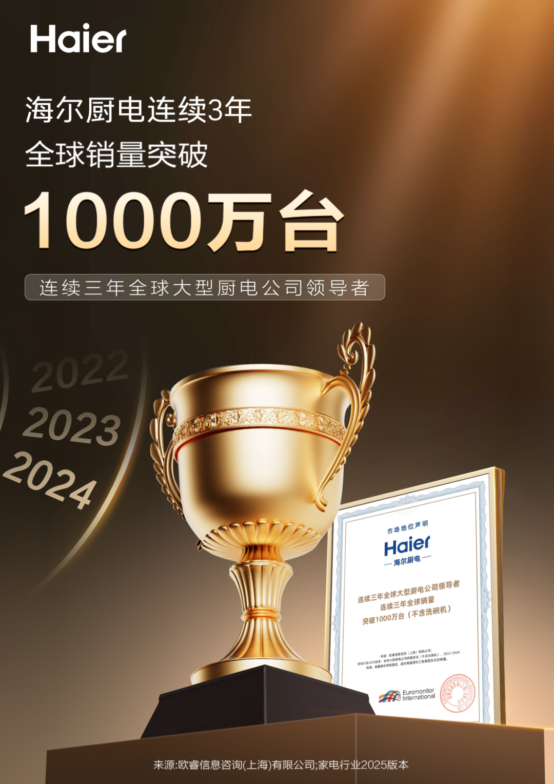 欧睿国际最新数据显示,海尔厨电在2022至2024年间全球年销量连续突破1000万台(不含洗碗机),成为国内唯一实现这一规模的厨电企业。